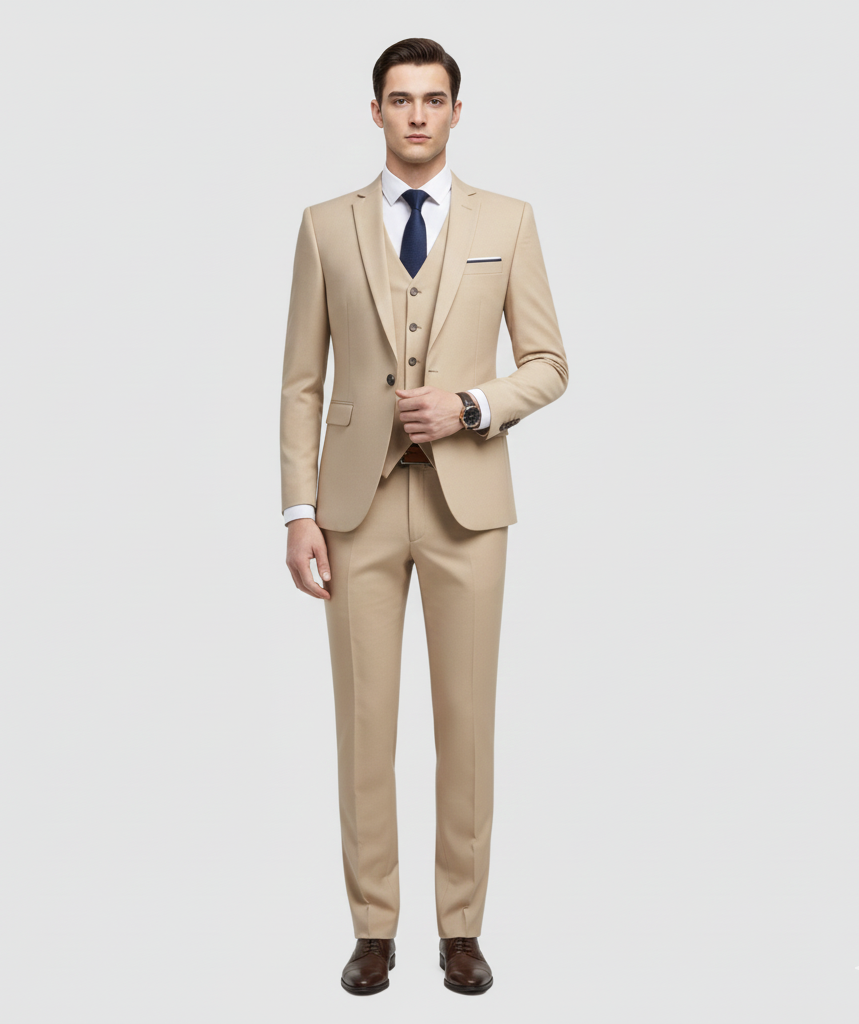 Αυτό το στενά κομμένο ανδρικό κοστούμι προσφέρει μια μοντέρνα και άψογη εφαρμογή. Είναι κατασκευασμένο από ένα πολύ δημοφιλές υφαντό μείγμα μαλλιού για επίσημες περιστάσεις, που ξεχωρίζει για την ισορροπία του ανάμεσα στην άνεση, την αναπνευσιμότητα και τη δομή. Ο σχεδιασμός με το ταιριαστό σακάκι, γιλέκο και παντελόνι εξασφαλίζει μια περιποιημένη εμφάνιση, ιδανική για εορταστικές εκδηλώσεις, επαγγελματικές συναντήσεις ή βραδινές περιστάσεις. Το εφαρμοστό κόψιμο προσαρμόζεται στο σχήμα του σώματος χωρίς να είναι άκαμπτο, προσφέροντας άνεση όλη μέρα. Η ραμμένη κατά παραγγελία κατασκευή και οι καθαρές λεπτομέρειες το καθιστούν ένα ευέλικτο ένδυμα για κάθε επίσημη γκαρνταρόμπα.