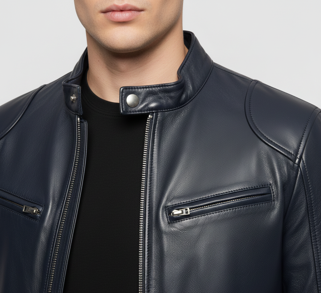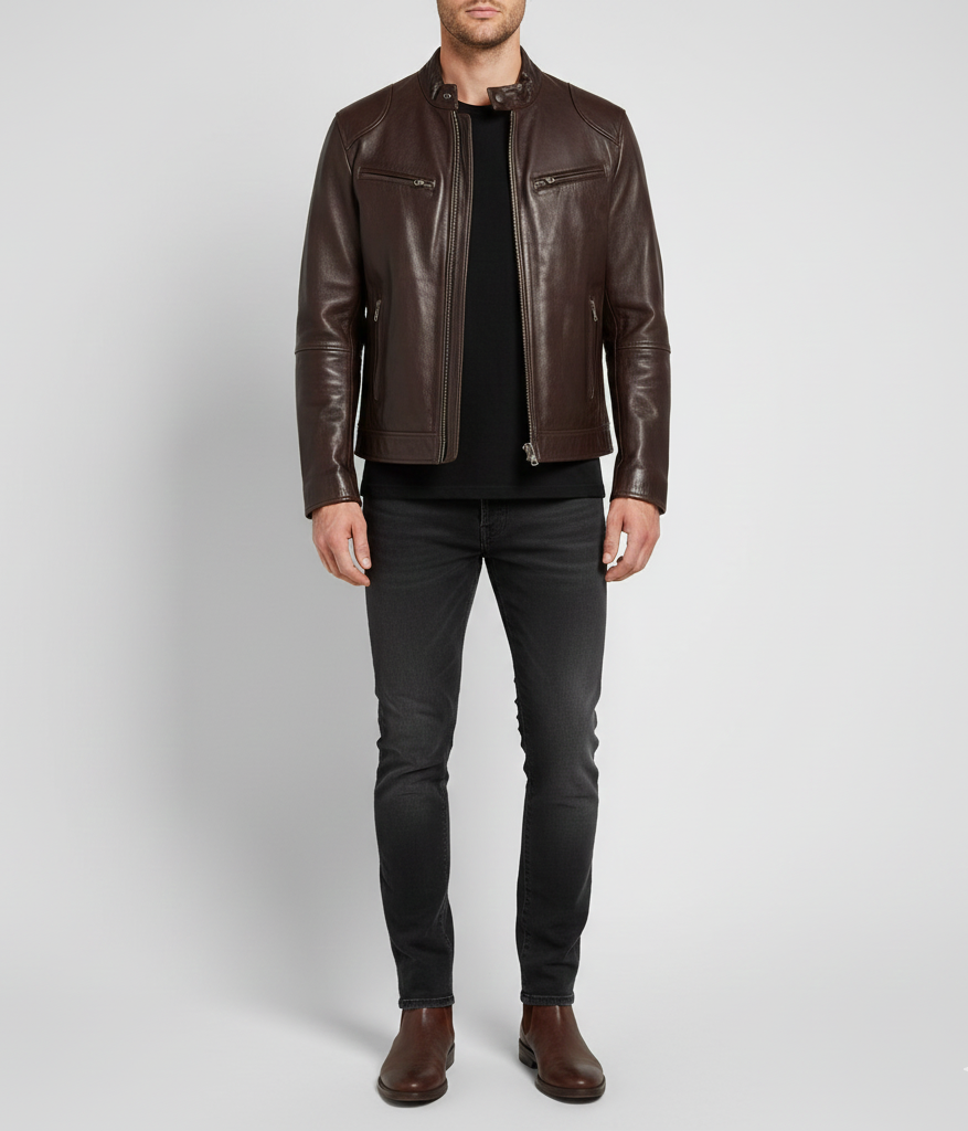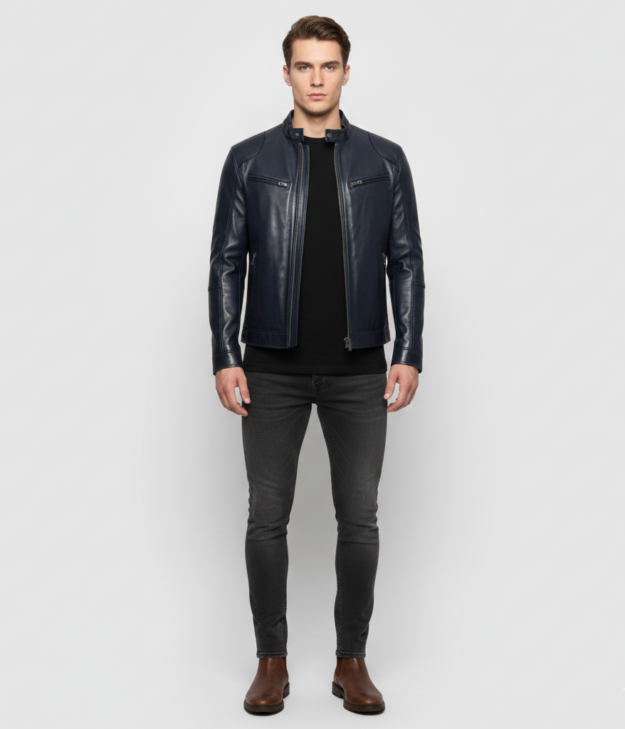 This men's jacket made of genuine leather offers a modern biker design with a comfortable, structured fit, ideal for everyday use and casual urban looks. The leather is sturdy, durable, and naturally comfortable to the touch, while reinforced seams and zippered pockets provide functionality and style. The mandarin collar with snap button increases practicality and ensures a secure fit on windy days. Perfect for transitional seasons or evenings in the city, it pairs easily with sweaters and jeans for a versatile, modern outfit.