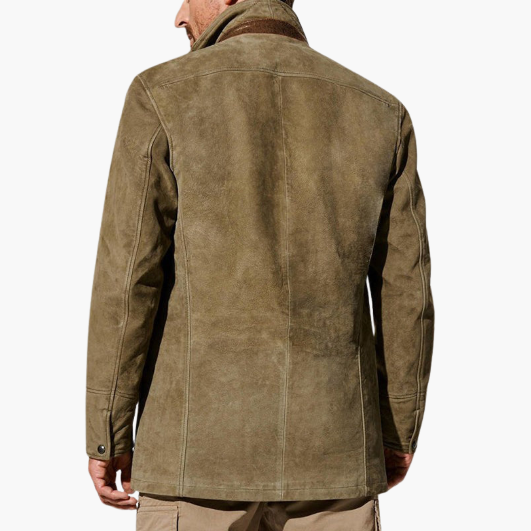 Veste pour homme en daim avec détails en cuir véritable. Elle a été conçue pour le confort et le style en période de transition, alliant fonctionnalité et design discret.